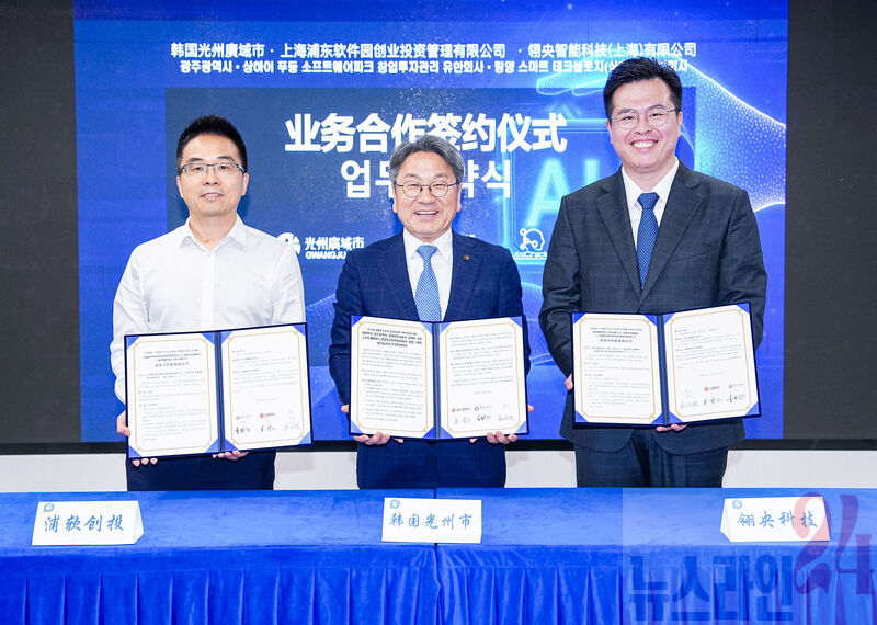 강기정 시장 등 광주광역시 대표단은 26일(현지시간) 중국 상하이 ‘푸둥 소프트웨어파크’에서 광주시·푸둥 소프트웨어파크 창업투자관리 유한회사·링양 스마트 테크놀로지 3자 간 ‘AI산업 생태계 조성과 글로벌 협력체계 구축을 위한 업무협약(MOU)’을 체결했다.
