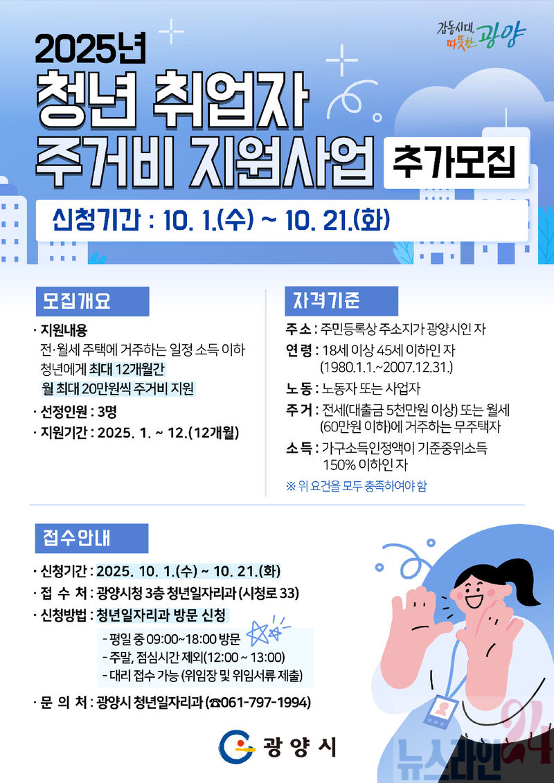 광양시(시장 정인화)는 청년들의 주거 안정을 위해 10월 1일부터 21일까지 ‘2025년 청년 취업자 주거비 지원사업’ 추가 모집을 진행한다고 밝혔다.