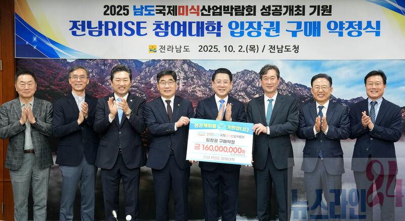 김영록 전라남도지사가 2일 도청 접견실에서 전남RISE 참여 대학 총장단과 2025 남도국제미식산업박람회 입장권 구매 약정을 체결하고 있다.