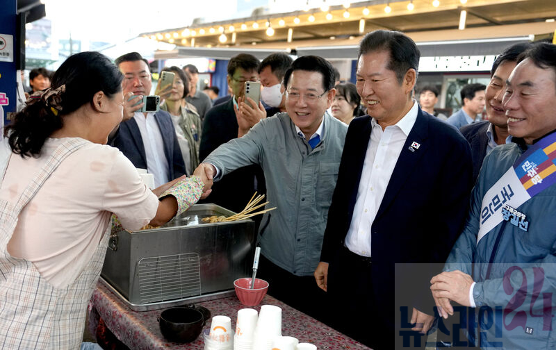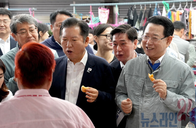 정청래 더불어민주당 대표와 김영록 전라남도 도지사가 추석명절을 앞둔 3일 구례5일장을 방문, 민생현장을 둘러보며 주민 및 상인들을 격려하고 있다.