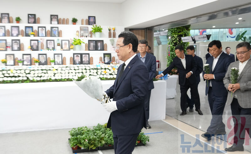 추석 명절을 앞둔 3일 오후 김영록 전라남도지사가 제주항공 여객기 사고 희생자 무안공항 합동분향소를 찾아 희생자들의 넋을 기리고 있다.