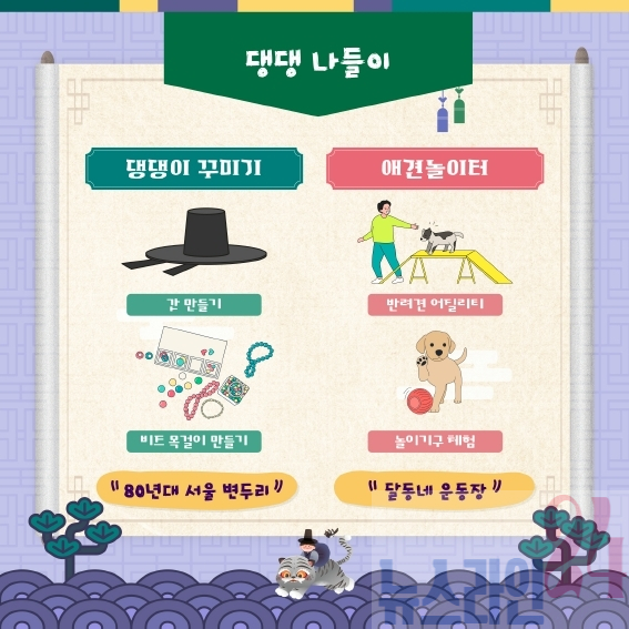 반려가족을 위한 ‘댕댕나들이 in 드라마촬영장’도 운영된다. 드라마촬영장 명소 6곳을 잇는 스탬프투어, 반려견 갓·비즈 목걸이 만들기, 전통 소품 포토존이 마련돼 보호자와 반려견이 함께 즐길 수 있다. 애견놀이터에는 놀이기구와 어질리티 체험장이 설치돼 반려견이 마음껏 뛰어놀 수 있고, 보호자를 위한 휴게 공간도 함께 제공된다.