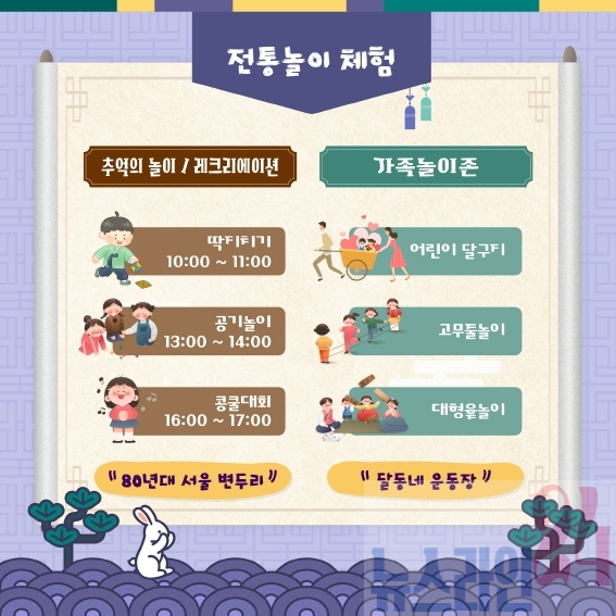 어린이 달구지, 고무줄놀이 등 가족놀이존과 소원지 쓰기 이벤트, 달고나·뻥튀기 같은 추억의 먹거리 판매도 현장 분위기를 더한다.