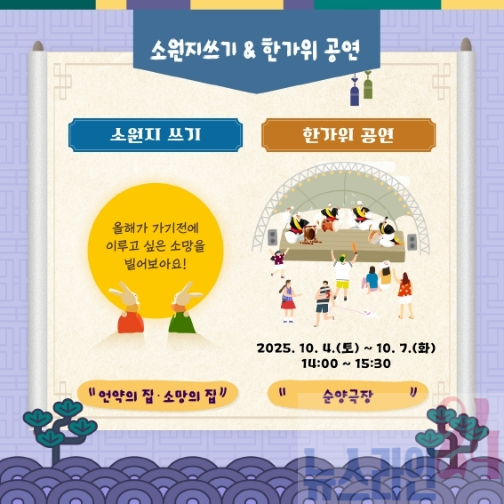 순천시(순천시장 노관규)는 3일부터 9일까지 7일간 드라마촬영장 일원에서 전통놀이, 공연, 가족체험, 반려견 프로그램을 결합한 다채로운 한가위 행사를 선보인다고 밝혔다.