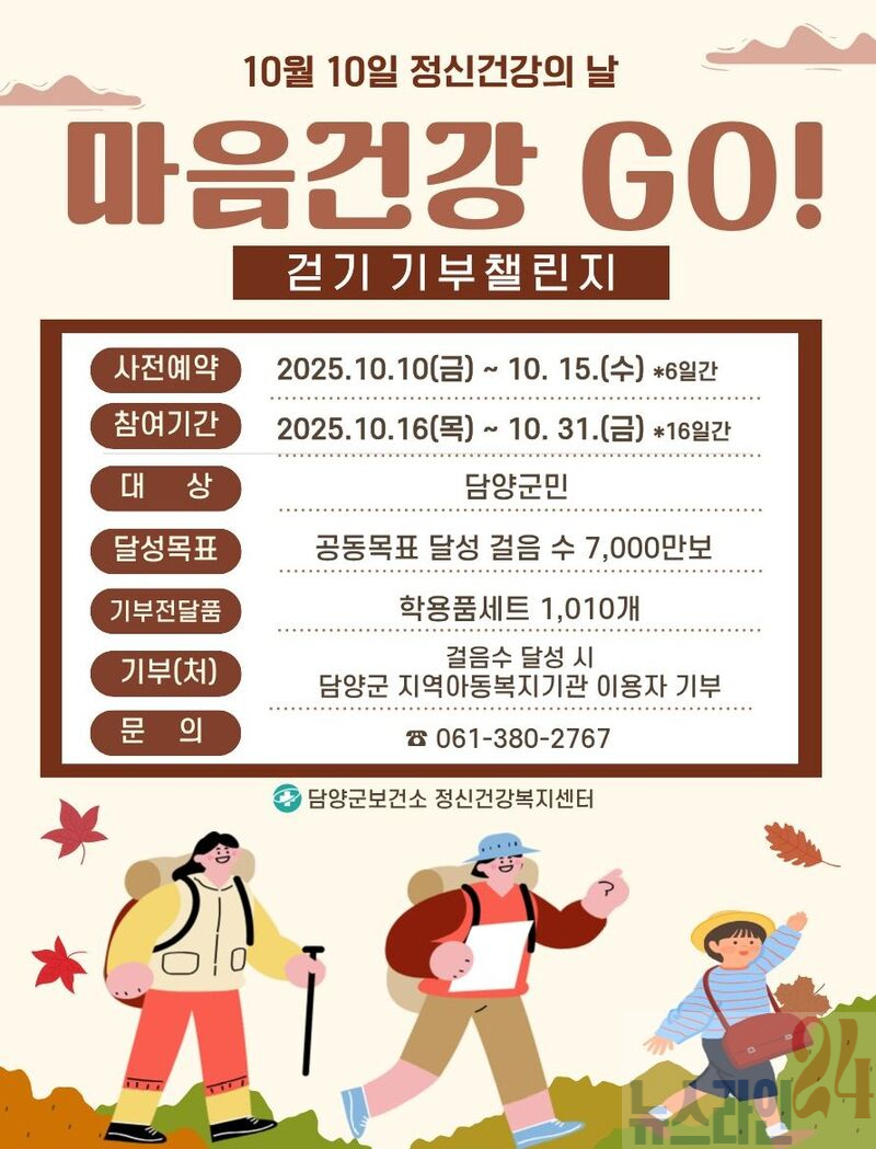 담양군(군수 정철원)은 10월 10일 ‘세계 정신건강의 날’을 맞이하여 전 군민을 대상으로 걷기 기부 챌린지를 운영한다고 밝혔다.