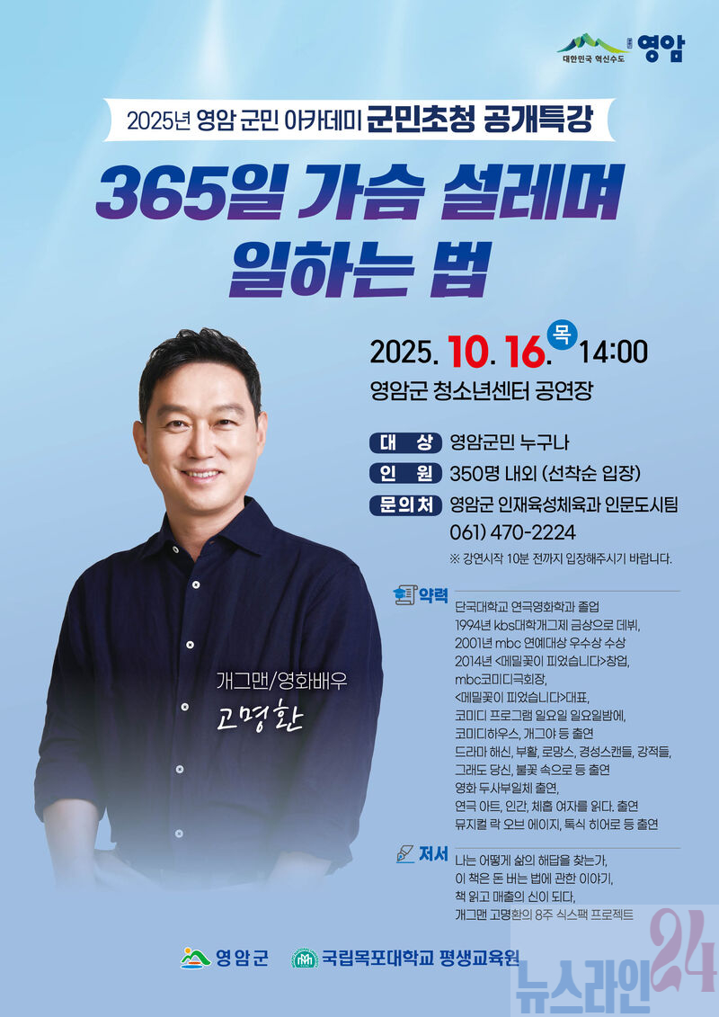 영암군(군수 우승희)이 10/16일 오후 2시 청소년센터에 개그맨이자 방송인인 고명환 씨를 초청해 군민아카데미 제5회 공개특강을 개최한다.
