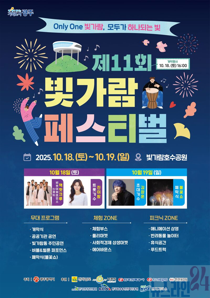 광주광역시(시장 강기정)는 전라남도, 나주시, 혁신도시 이전 공공기관과 함께 오는 18~19일 이틀간 나주 빛가람동 호수공원 일원에서 ‘2025년 제11회 빛가람페스티벌’을 개최한다.