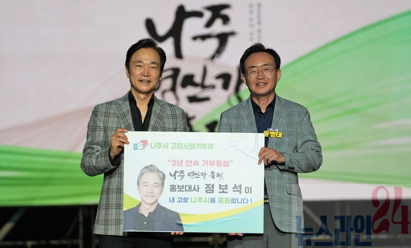 나주 반남면 출신인 정보석 배우는 지난 12일 영산강정원에서 열린 2025 나주영산강축제 폐막식에서 윤병태 나주시장에게 성금을 기탁했다. 지난 2023년, 2024년에 이어 3년째 이어지는 고향사랑이다.