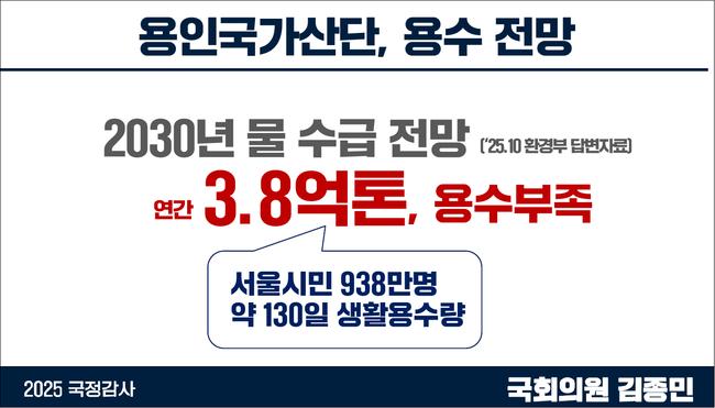 김종민 “2030년 한강권 물 3.8억 톤 부족... 600조 용인국가산단, 지속 불가능” 환경부 국감자료 “2030 한강권 물 부족 3.8억톤”… 서울시 4개월치 규모 “전력·용수·RE100 모두 불안… 반도체 경쟁력 자체가 흔들릴 것” “용인 산단 재검토하고, 수도권 R&D·비수도권 생산 중심 ‘K-트라이앵글 전략’ 추진해야”