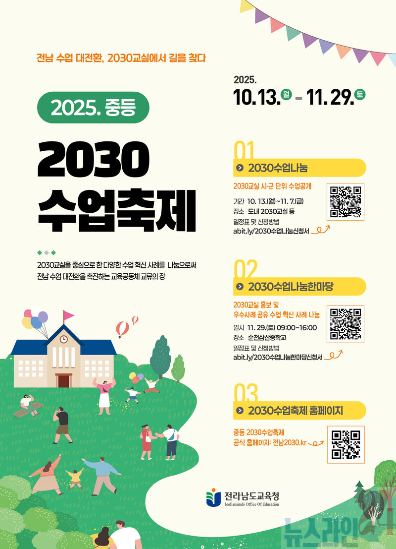 ‘전남 수업 대전환, 2030교실에서 길을 찾다’를 주제로 한 이번 축제는 수업 혁신 사례를 공유하고, 2030교실의 방향을 모색하는 자리로 마련된다. 축제는 크게 ‘2030수업나눔’과 ‘2030수업한마당’으로 나뉘어 열린다.