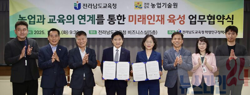 전라남도교육청(교육감 김대중)은 10월 14일 청사 5층 비지니스실에서 전라남도 농업기술원(원장 김행란)과 ‘농업과 교육의 연계를 통한 미래인재 육성 업무협약’을 체결했다.