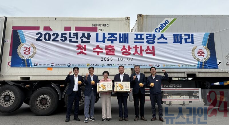 나주시(시장 윤병태)는 최근 장현순 네시피F&B 대표, 이동희 나주배원예농협 조합장, 최명수 전남도의원 등 관계자가 참석한 가운데 나주배 프랑스 첫 수출 상차식을 진행했다고 14일 밝혔다.