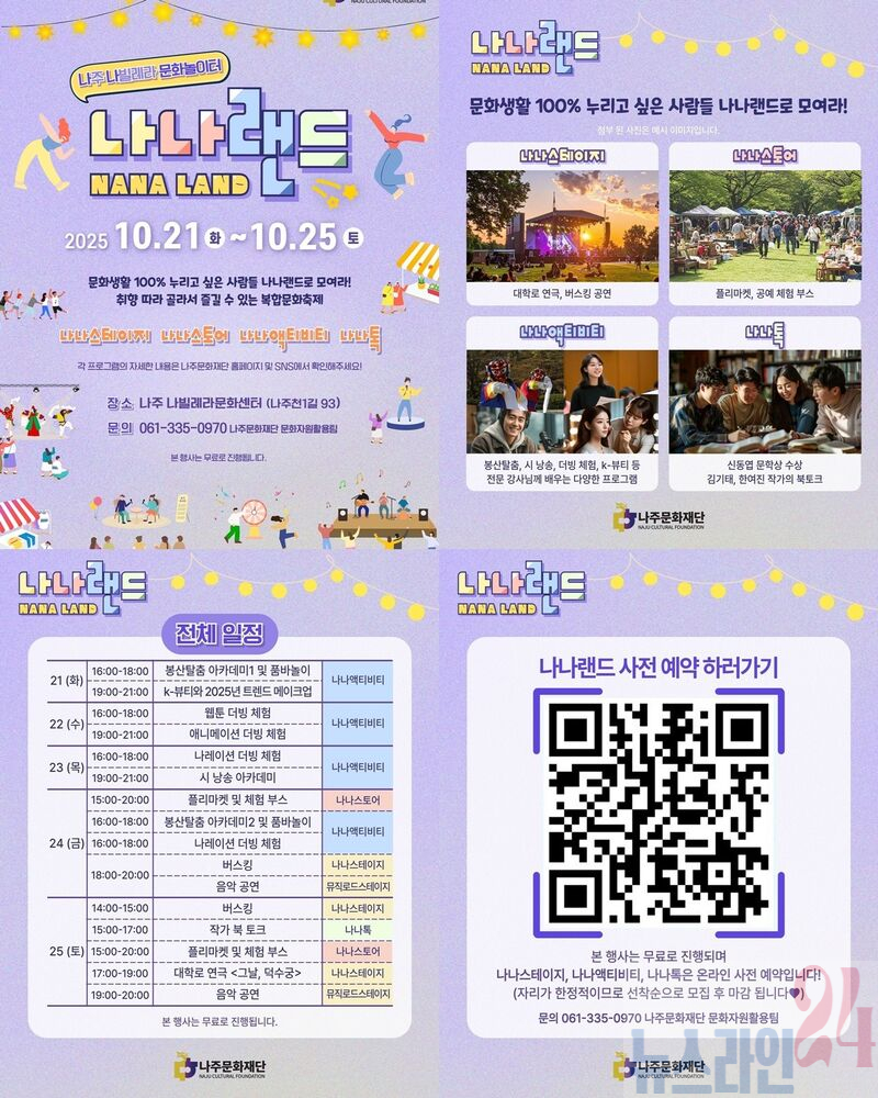 김찬동 나주문화재단 대표이사는 “‘나나랜드’는 시민이 주체가 되어 문화를 함께 만들고 즐기는 축제가 될 것”이라며 “지역의 일상에 문화가 자연스럽게 스며들 수 있도록 시민 중심의 문화예술 프로그램을 지속적으로 추진하겠다”고 말했다.