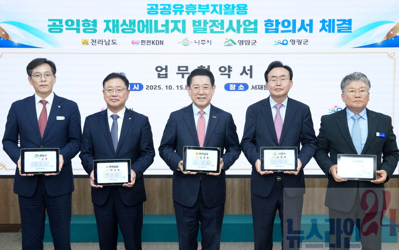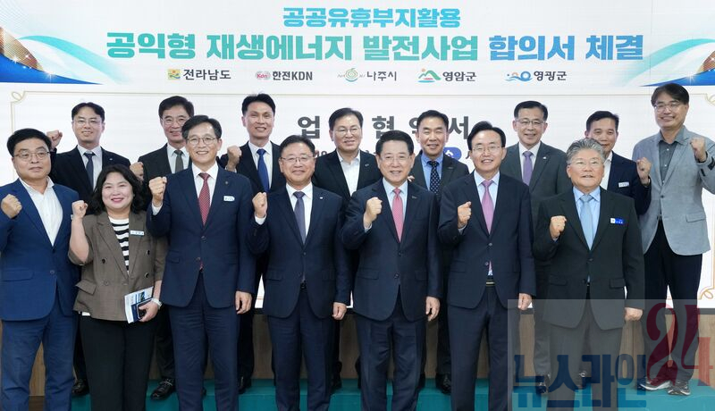 전라남도는 15일 새정부의 재생에너지 대전환 기조와 재생에너지 보급 확대 정책에 따라 나주시, 영광군, 영암군, 한전KDN과 탄소중립 실현·에너지 기본소득 실현을 위한 ‘공익형 재생에너지 발전사업’ 업무협약을 했다고 밝혔다.