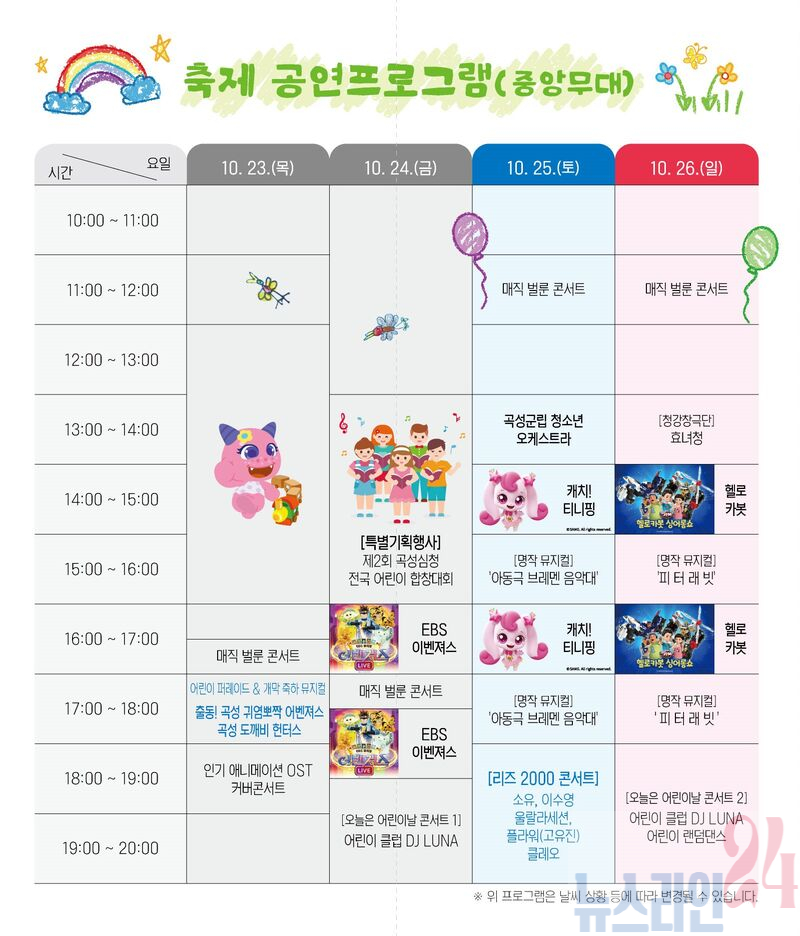 축제 기간에는 어린이들에게 가장 인기 있는 공연들을 매일 준비되어 있다. ▲23일 인기 애니메이션 OST 커버 콘서트 ▲24일 ‘EBS 이벤져스’ ▲25일에는 ‘캐치! 티니핑’과 ‘아동극 브레멘 음악대’ ▲26일 ‘헬로카봇’과 ‘피터래빗’이 공연된다. 아울러, 매일 중앙무대에서는 매직 벌룬 콘서트가 펼쳐져 축제의 즐거움을 더할 예정이다.
