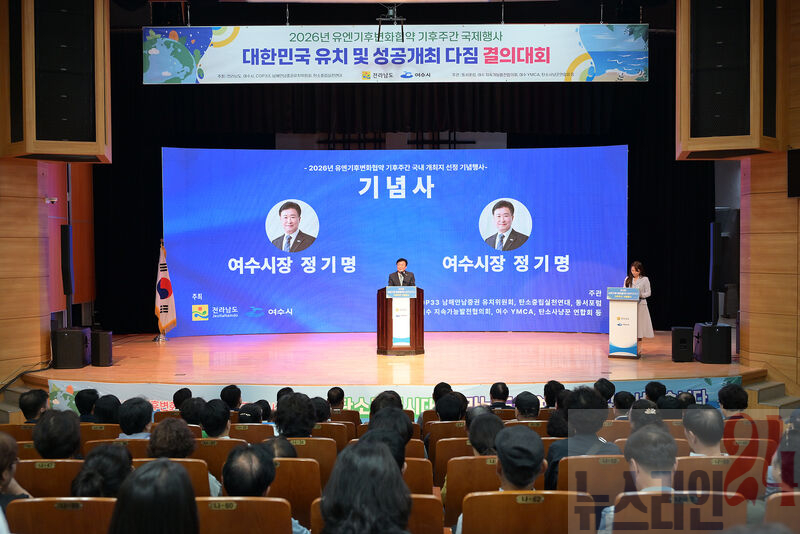 여수시(시장 정기명)는 지난 14일 진남문예회관에서 ‘2026년 유엔기후변화협약(UNFCCC) 기후주간(Climate Week)’ 국내 개최 후보지 선정을 기념하는 행사를 열고 유치를 위한 의지를 다졌다.