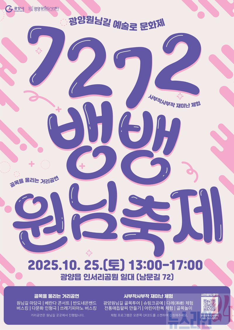 광양문화도시센터(센터장 박시훈, 이하 ‘센터’)는 오는 10월 25일(금) 오후 광양읍 인서리공원 일대에서 광양원님길 브랜드 축제 ‘7272뱅뱅원님축제’를 개최한다고 밝혔다.