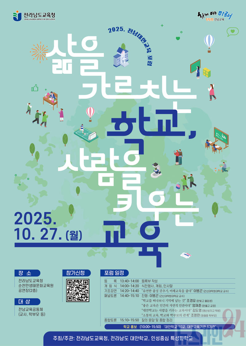 전라남도교육청(교육감 김대중)은 오는 27일 순천만생태문화교육원에서 학부모·교사가 참여하는 ‘2025 전남 대안교육 포럼’을 개최한다.