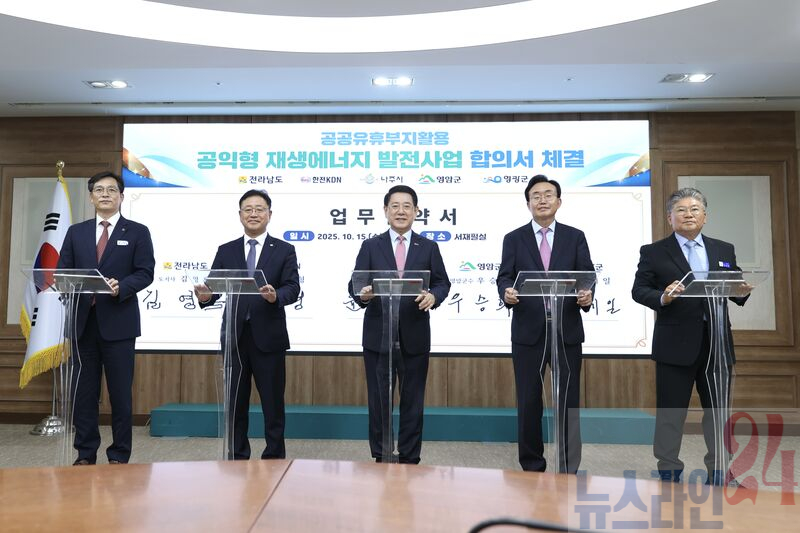 영암군(군수 우승희)이 15일 전남도청에서 전라남도, 나주시, 영광군, 한전KDN(주)과 ‘공공 유휴부지 활용 공익형 재생에너지 발전사업 업무협약’을 체결했다.