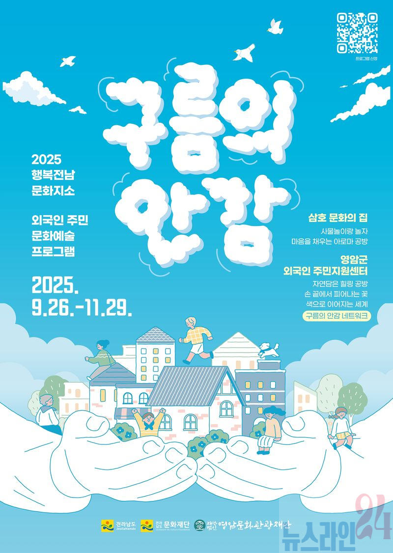 (재)영암문화관광재단은 문화예술을 매개로 외국인 주민과 지역 주민 간의 소통과 이해를 증진하기 위한 “구름의 안감”프로젝트를 오는 17일 밝혔다. 이 프로젝트는 구름 안감 속에 서로 다른 숨결들이 조화를 이루어 한 공간 속에서 새로운 꿈을 만들어 가길 바라는 관점에서 기획되었다.