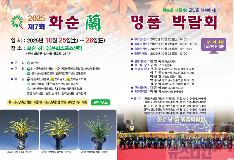 대한민국 난(蘭) 산업의 중심지로 자리매김하고 있는 전남 화순군(군수 구복규)이 ‘제7회 2025 화순 난 명품 박람회’를 오는 10월 25일(토)부터 26일(일)까지 이틀간 화순 하니움문화스포츠센터 실내체육관에서 개최한다.