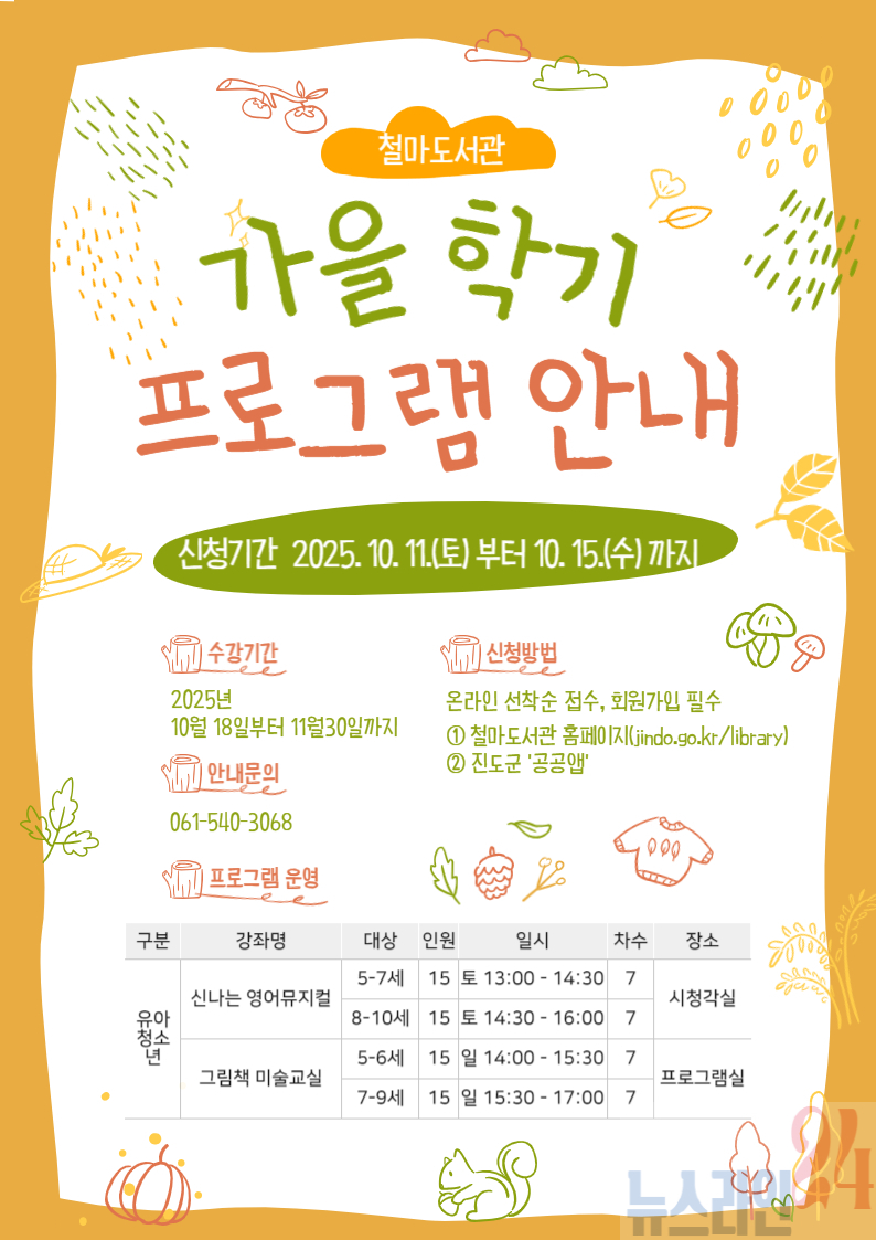 진도군 철마도서관은 군민들에게 다양한 독서 문화를 체험할 수 있는 기회를 제공하기 위해 10월 18일(토)부터 7주간 ‘2025년 가을학기 프로그램’을 운영한다고 밝혔다.