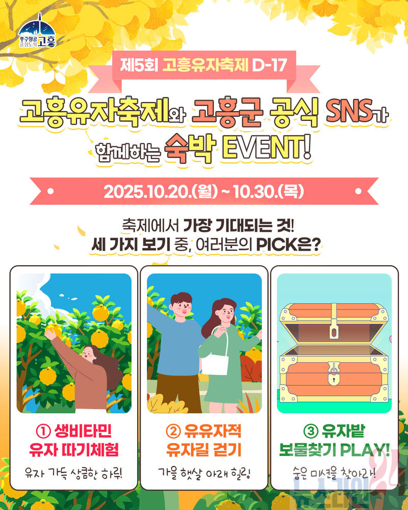 고흥군(군수 공영민)은 10월 20일부터 30일까지 11일간, 고흥군 공식 SNS 채널을 통해 ‘제5회 고흥유자축제 D-17! 숙박이벤트’를 진행한다고 밝혔다.