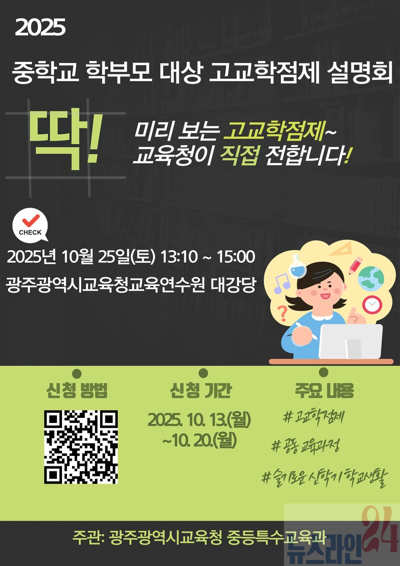 광주시교육청(교육감 이정선)은 오는 25일 오후 1시 광주시교육청교육연수원 대강당에서 중학교 3학년 학생 학부모를 대상으로 ‘고교학점제 설명회’를 개최한다.