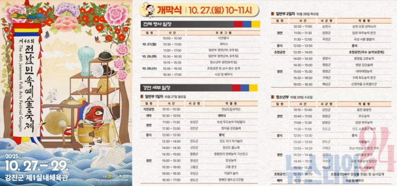 마지막 날인 29일에는 청소년부 경연이 진행되며, 강진 옴천초등학교를 비롯한 9개 학교·단체가 참여해 어린이와 청소년이 전통문화를 이어가는 무대를 선보인다.
