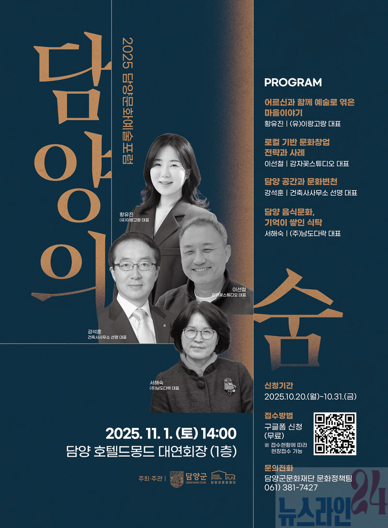 담양군문화재단(이사장 정철원, 이하 재단)은 11월 1일 토요일 오후 2시, 담양 호텔드몽드 대연회장에서 2025 담양 문화예술포럼 「담양의 숨」을 개최한다고 밝혔다.
