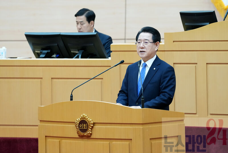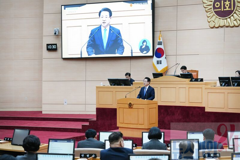 김영록 전라남도지사가 6일 전남도의회 본회의장에서 열린 제387회 임시회 제1차 본회의에서 2025년도 도정 업무보고를 하고 있다.