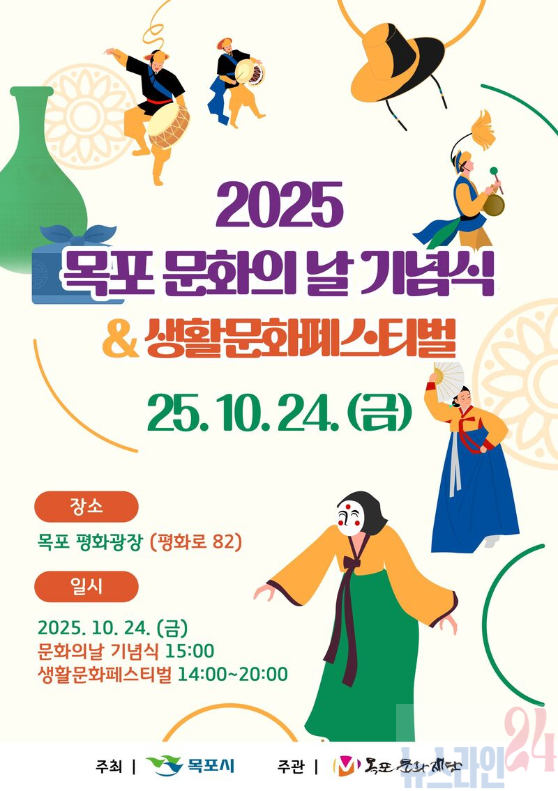 목포문화재단(이사장 조석훈)은 오는 10월 24일(금) 오후 2시 평화광장에서 ‘2025 목포 문화의 날 기념식 및 생활문화페스티벌’을 개최한다.