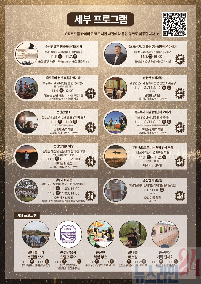주요 프로그램은 마을 주민들이 직접 안내하는 △순천만 마을탐방 △흑두루미 관찰 체험 △순천만 소리명상 △새벽 선상 투어 △순천만 별빛 여행 △갈대울타리 소원글 쓰기 △희망농업단지 벼베기 등 자연과 교감하는 다채로운 프로그램이 운영된다.