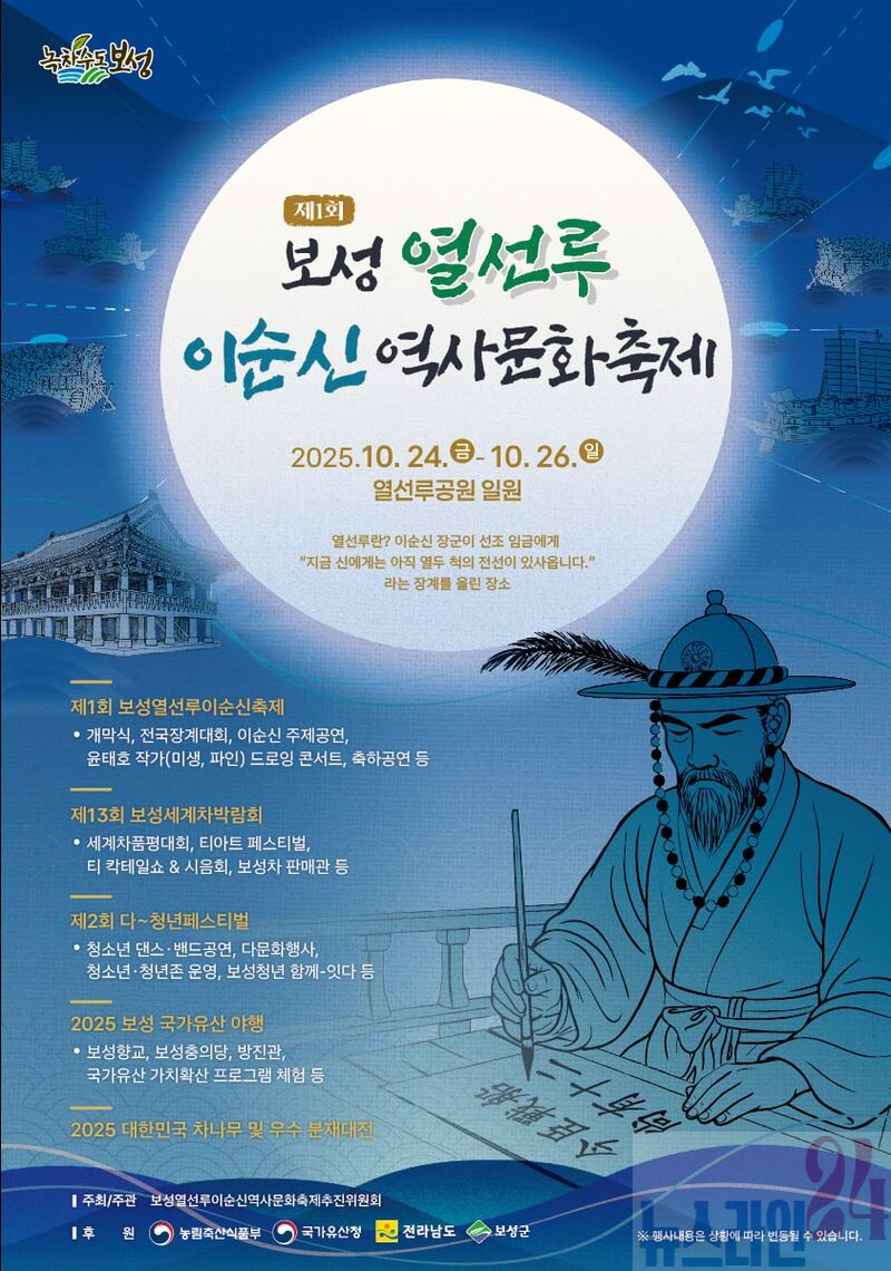 보성군(군수 김철우)은 오는 10월 24일부터 26일까지 3일간, 보성읍 열선루공원 일원에서 ‘제1회 보성 열선루 이순신 역사 문화 축제’를 개최한다.