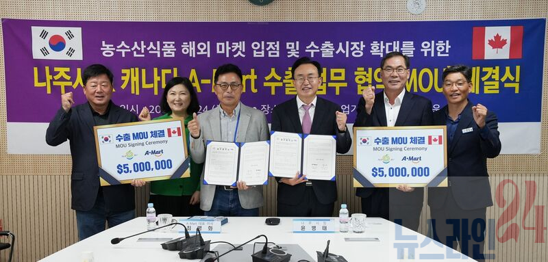 나주시(시장 윤병태)는 지난 24일 전라남도 농업기술원에서 캐나다 A-Mart(대표 최병화)와 500만 달러 규모의 농수산식품 수출 업무협약(MOU)을 체결했다고 27일 밝혔다.