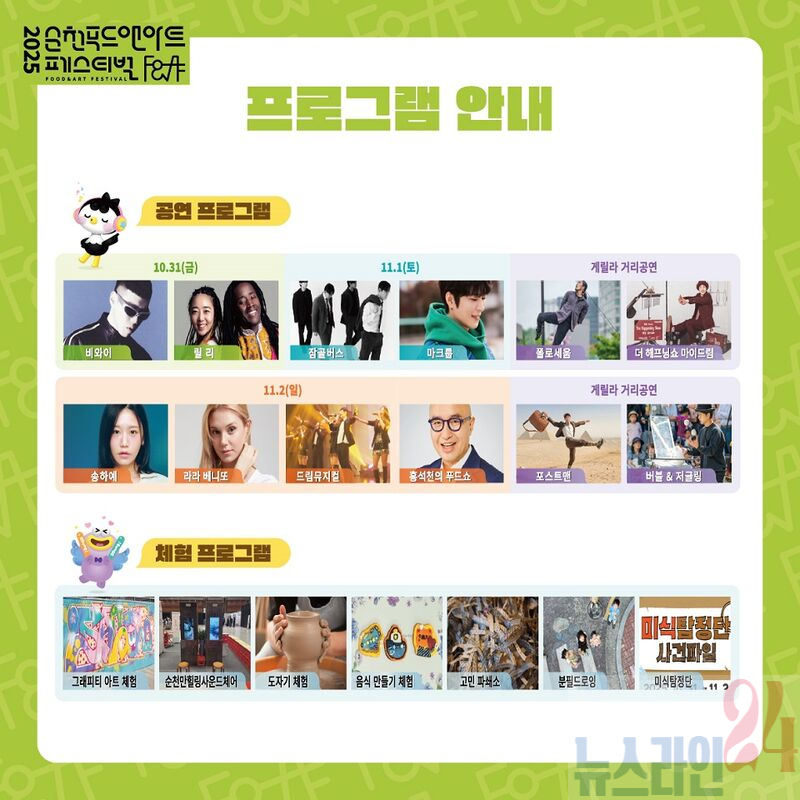 순천시(시장 노관규)는 오는 10월 31일부터 11월 2일까지 원도심 중앙로 일원에서 ‘푸드와 아트가 하나되는, 푸아하 순천’을 슬로건으로 한 「2025 순천 푸드앤아트페스티벌」을 개최한다. 푸드앤아트페스티벌은 매년 중앙로 4차선 도로를 전면 통제하고 도심 한복판을 거대한 축제장으로 바꾸는 순천의 대표 도심형 거리축제다. 올해는 여기에 ‘착한가격·착한소비·착한환경’이라는 세 가지 키워드를 더해, 누구나 즐겁고 부담 없이 참여할 수 있는 ‘착한 축제’로 새롭게 선보인다.