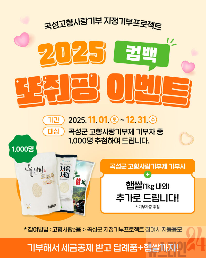 두 달 동안 10만 원 이상 기부자에 대해 매달 500명을 무작위 추첨해 1만 원 상당의 지역 쌀을 증정한다. 참여 방법은 고향사랑e음 또는 위기브 등 민간 플랫폼을 통해 곡성군에 기부하면 자동으로 응모되며, 당첨자는 개별 통보된다.