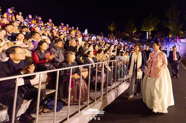김혜경 여사가 29일 경북 경주 월정교 수상특설무대에서 열린 ‘2025 APEC 정상회의 기념 한복패션쇼’를 관람하며, 한복의 전통과 미래를 아우르는 무대에서 세계 각국 귀빈들과 함께 K-컬처의 정수를 나눴다.