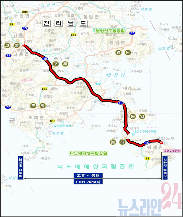 ‘국도 15호선 고흥~봉래 확장사업’은 고흥군 고흥읍 호형리부터 봉래면 예내리(나로우주센터)까지 31.7km 구간을 기존 2차로에서 4차로로 확장하는 사업이며, 총사업비는 6,521억 원(예비타당성조사 기준) 규모다.