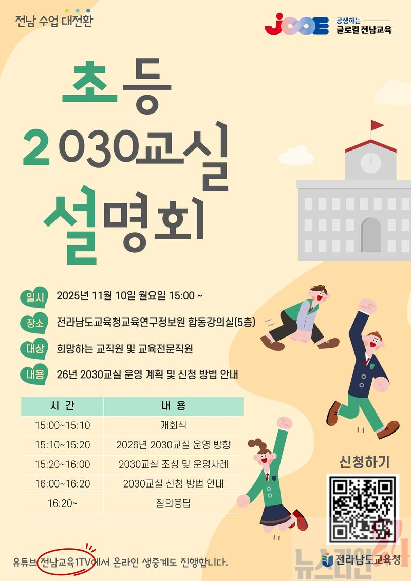이와 관련해 전남교육청은 오는 10일 오후 3시 전라남도교육청교육연구정보원에서 ‘초등 2030교실 설명회’를 열어 2026학년도 2030교실 운영 계획과 신청 방법을 안내한다. 설명회는 운영 방향 안내와 사례 나눔, 신청 절차 및 질의응답 순으로 진행되며, 관심 있는 교직원은 공문 및 포스터 QR코드를 통해 참여할 수 있다. 당일 행사는 유튜브 ‘전남교육1TV’를 통해 실시간 중계된다.