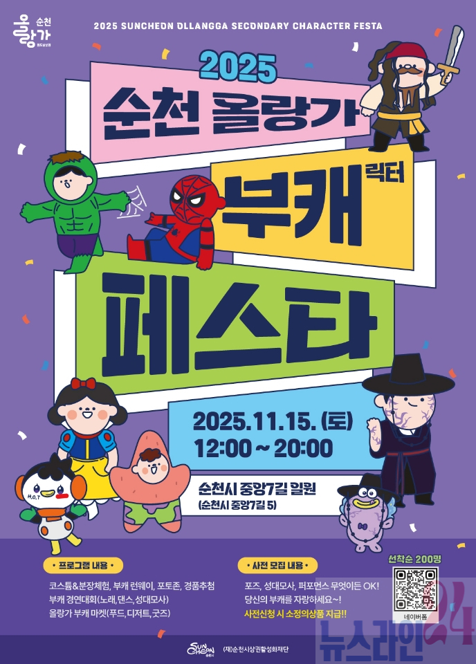 순천시(시장 노관규)는 오는 15일(토) 낮 12시부터 오후 8시까지 중앙7길 일원에서 원도심 상권 활성화를 위한 특화 테마 축제 ‘2025 순천 올랑가 부캐 페스타’를 개최한다고 밝혔다.