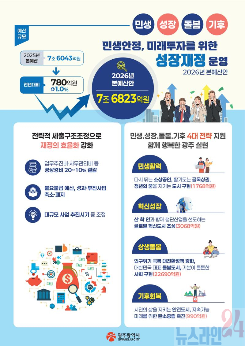 2026년도 예산안은 ‘민생‧성장·돌봄‧기후4대 전략, 함께 행복한 광주’를 실현하기 위한 방향으로 편성했다. 광주시는 특히 ▲민생활력 : 서민경제 안정과 골목상권 재도약 지원 ▲혁신성장 : 미래산업 선도와 글로벌 혁신도시 도약 ▲상생돌봄 : 인구위기 대응과 전 생애주기 복지 실현 ▲기후회복 : 2045 탄소중립과 안전한 도시 구현 등 4대 전략에 중점적으로 투자한다.