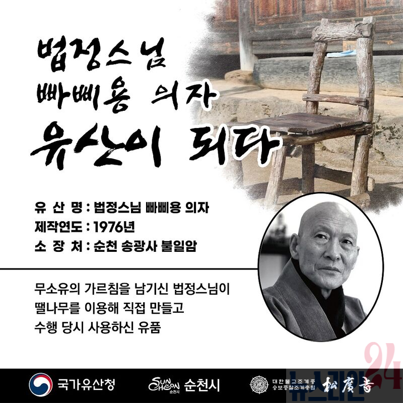 순천시(시장 노관규)는 순천 송광사 불일암에서 고(故) 법정스님이 직접 제작해 사용한 ‘빠삐용 의자’를 포함한 10건이 근현대 예비문화유산에 선정됐다고 밝혔다.