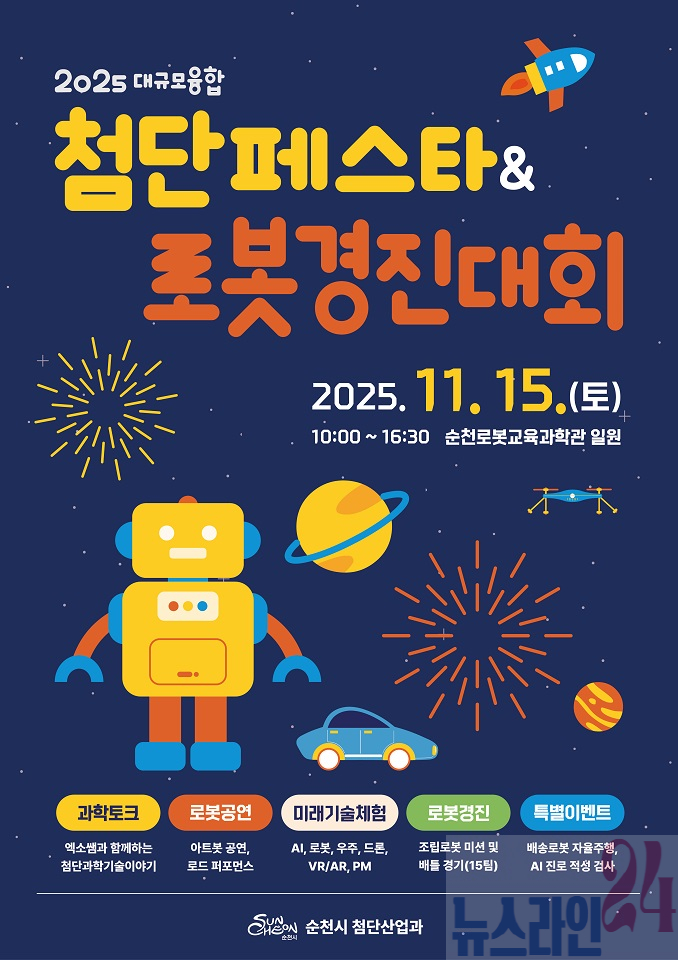 순천시(시장 노관규)는 오는 15일(토) 순천로봇교육과학관 일원에서 일상 속 친구로 다가온 로봇의 다양한 미래기술 체험을 위한 “2025 첨단페스타 & 로봇 경진대회”를 개최한다고 밝혔다.
