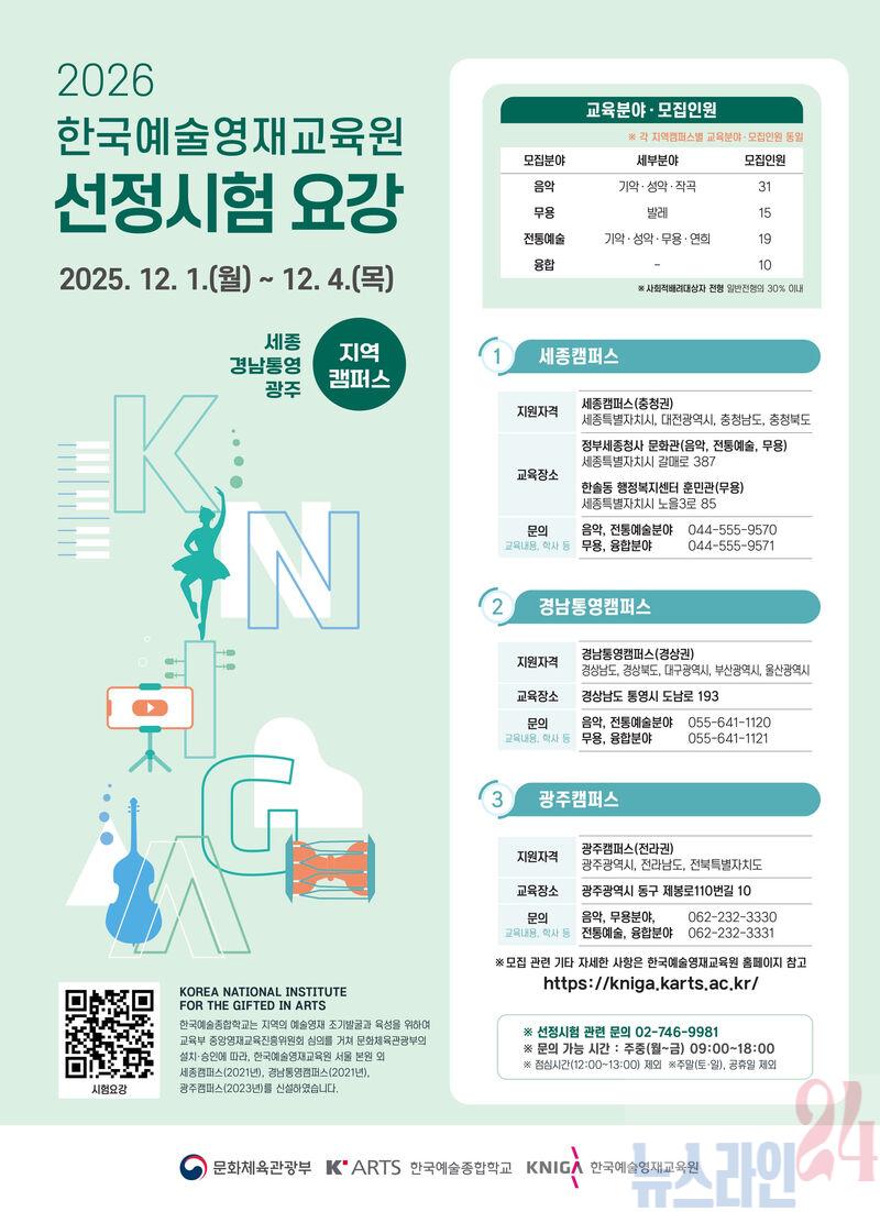 자세한 사항은 한국예술영재교육원 누리집(https://kniga.karts.ac.kr)을 참고하거나 한국예술영재교육원 교육지원팀(02-746-9981)으로 문의하면 된다.
