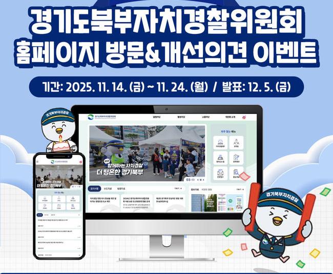 경기도북부자치경찰위원회 누리집 전면 개편…모바일 편의·도민 소통 강화 사진·그래픽 중심의 직관적 디자인으로 정보 접근성 개선 11월 14~24일 온라인 이벤트…의견 제출 참여자 100명에 경품 제공
