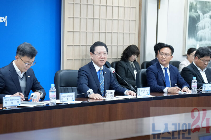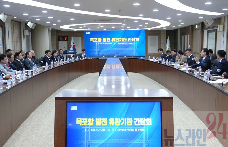 김영록 전라남도지사가 14일 도청 서재필실에서 열린 ‘목포항 발전 유관기관 간담회’에 참석해 관계자들과 목포항을 전남 서남권 핵심산업 지원 항만으로 육성하기 위한 협력 방안을 논의하고 있다.