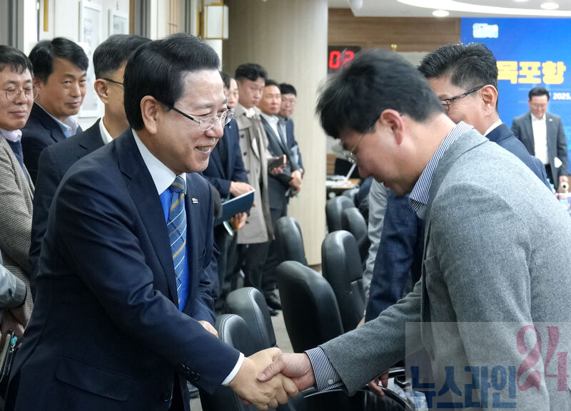 김영록 전라남도지사가 14일 도청 서재필실에서 열린 ‘목포항 발전 유관기관 간담회’에서 참석자들과 인사를 나누고 있다.