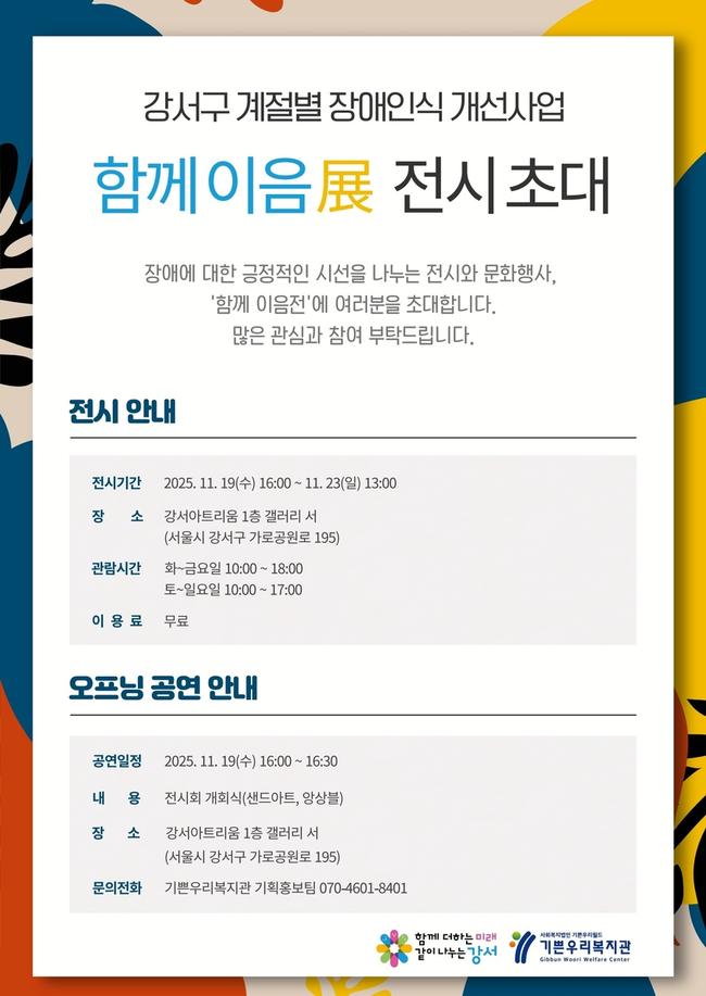 진교훈 강서구청장은 "이번 전시는 장애인분들의 진정성 있는 표현과 삶의 이야기를 지역사회와 나누는 뜻깊은 자리"라며, "예술을 통해 서로를 이해하고 연결하는 포용의 문화가 확산되길 바란다"고 말했다.