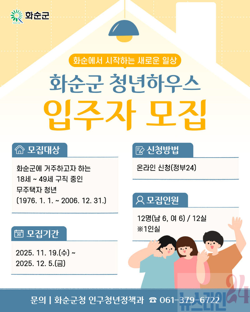 화순군(군수 구복규)은 지역 청년의 안정적인 주거환경 조성과 자립 기반 마련을 위해 2026년 화순군 청년하우스 입주자 모집을 11월 19일(수)부터 12월 5일(금)까지 진행한다고 밝혔다.